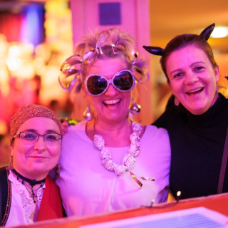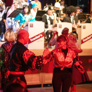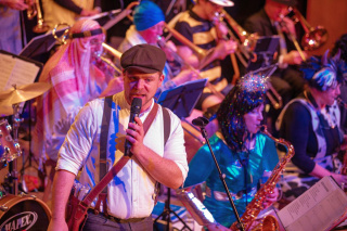 Immer wieder begeisterten Instrumental-Solisten in der von Schlagzeuger Michael Keul geleiteten Bigband aus dem Umfeld der Musikschule. Zum Faschingsball passte, dass sowohl die Musiker als auch ihr Publikum durchwegs maskiert erschienen. Kostüme aus dem Berlin der 20-iger Jahre, Gäste, wie aus dem Wiener Opernball, Rock and Roller im Outfit ihrer Zeit. Dazu war die halbe Tierwelt unterwegs, manches Raubtier, andere direkt vom nahen Bauernhof. Die Stimmung beschrieb ein Tänzer, den wir befragten, mit einem Wort überzeugend: „Wunderbar“.