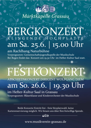 Mit der Akustik eines Konzertsaales bietet der Rachlhang die passende Umgebung für das Bergkonzert der Marktkapelle Grassau mit Leiter Wolfgang Diem und über 50 Musikanten. So stimmt ab 11 Uhr bayerische Blasmusik in den musikalischen Sonntag mit Konzertanten wie mitreißenden Klängen ein. Akustische Akzente setzen die Solisten, wenn sie sich andernorts im Hang aufstellen und so Klangerlebnisse bringen. Bei Regen spielt die Marktkapelle im Tal, im Hefterstadl in Grassau.