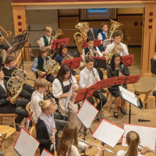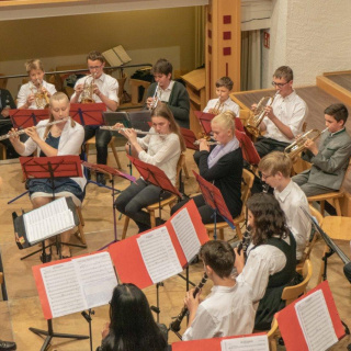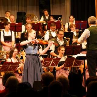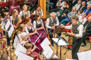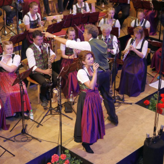 Den hatte die Marktkapelle jeweils mit einem Gast eröffnet. Am ersten Konzertabend gehörte der Beginn Marlene Noichl und dem Kinderorchester. Noch nie hatten die 11 Kinder im Alter von 8 bis 12 Jahren vor so einem großen Publikum gespielt. Doch sie schlugen sich tapfer und eroberten die Herzen der Zuhörer. Mit „Welcome to the World“ von Jacob de Haan begrüßten sie ihre Zuhörer. Dann ließen sie im „Railway Traffic“ von Ivo Kouwenhoven einen Zug durch den Heftersaal fahren. In diesem Stück übernahmen drei Dirndln sogar einen Solopart. Zum Schluss spielten sie Jingle Bells und ernteten kräftigen Applaus.