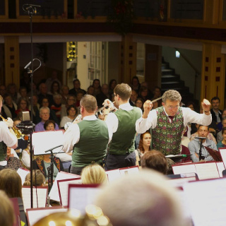 Es folgte das Glanzstück des diesjährigen Stefani-Konzertes, das Alphorn-Capriccio von Rainer Bartesch. Für Diem dirigierte Christine Gassner das Stück mit seinen vielen Facetten von laut und leise, von gefühlvoll und zart zu mitreißend glanzvoll. Als Solisten zeichneten sich mit dem Alphorn Theresa Lange, Stefan Hildebrand und Wolfgang Diem aus. Das Publikum im vollen Saal spendete gewaltigen Beifall. Nach dieser Herausforderung spielten die Musiker befreit auf das Ende zu. Mit E-Bass und E-Gitarre vervollständigten Tobias Voges und Stefan Brandl die Kapelle für ein Earth, Wind und Fire Medley. Das unterstrich einmal mehr die Vielseitigkeit der Marktkapelle. Nach Valentin’s Choral schloss das Konzert wunderbar mit der Tannenluft Bravourpolka, so hatten die Musiker geplant. Doch das Publikum verlangte nachdrücklich Zugaben. So dauerte es bis zum besonderen Schlussapplaus des begeisterten Publikums. „Für uns Musikanten ist es ein Jahreshöhepunkt“, meinte Leiter Wolfgang Diem im Anschluss. „Da freut es uns sehr, wenn wir solchen Zuspruch vom Publikum erfahren.“