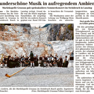 Die Marktkapelle Grassau hat ihr Sommerkonzert am Donnerstag den 08. August kurzfristig vom Hefterstadel in den Steinbruch Bosch in Lanzing Marquartstein verlegt. Grund dafür war die bereits frisch angelegte Naturbühne, die ursprünglich für ein anderes Konzert geplant war.